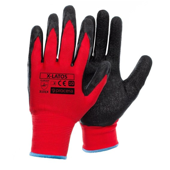 Rękawice X-LATOS wykonane z czerwonego poliestru, powlekane w części chwytnej lateksem o szorstkowanej strukturze. Idealne do prac manualnych. Bardzo dobra chwytność. Dobrze dopasowują się do kształtu dłoni. Rozciągliwe i elastyczne. Zakończone ściągaczem. CE EN 388. Opakowanie: karton 12/240. Kolor:czerwono/czarny.