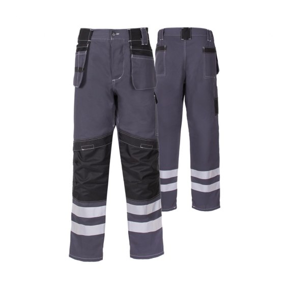 Spodnie monterskie PROMONTER COTTON. Spodnie wykonane z wytrzymałej na rozdzieranie i tarcie tkaniny bawełnianej - 100% bawełny o gramaturze 250g/m2. 8 funkcjonalnych kieszeni w tym dwie kieszenie wiszące z dodatkowymi przegródkami, dwie kieszenie tylne, kieszeń na calówkę, kieszeń typu bojówka, dla dodatkowej wygody taśmy do zawieszenia narzędzi takich jak np. młotek. Możliwość zastosowania wkładek nakolannikowych. Gumy dopasowujące w bocznych częściach pasa. Dodatkowe wzmocnienia, rygle i podwójne szwy zwiększające wytrzymałość. Taśmy odblaskowe zwiększające wiedoczność. Wyprodukowano w Polsce zgodnie z ISO 9001. Rozmiary od 46-62. EN ISO 13688:2013
